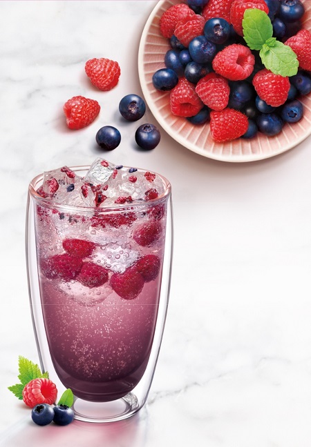 將新鮮覆盆子果實搭配有綿密氣泡的七喜汽水,再撒上嚴選的蔓越苺與藍苺果乾做點綴,杯中閃爍的淺紫色苺果光芒,加上氣泡與果露堆疊的療癒漸層色,令少女們一見傾心。