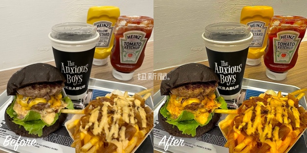 去吃美式漢堡和披薩,照片也要很「美」式吧!為了營造暗調和鮮豔的復古氛圍感,重點就是「增豔」先調高50,減少對比讓色調較統一,最後關鍵就是「亮部」,想要暗一點就直接拉到100,可以讓「亮度」也一起減少!