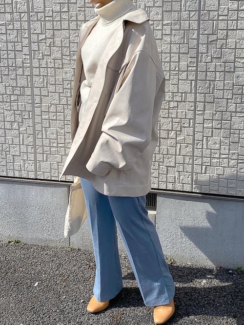 第三種「高腰寬褲 × 中長版皮衣外套」則是推薦給對下半身比較沒自信的女孩。利用褲子的高腰版型將身長的視覺比例拉高,寬鬆直筒的剪裁也能有效修飾惱人的馬鞍肉,最重要的是外搭一件中長版的皮衣外套,還可再遮住臀部。(將可惡的肉肉藏好藏滿!)