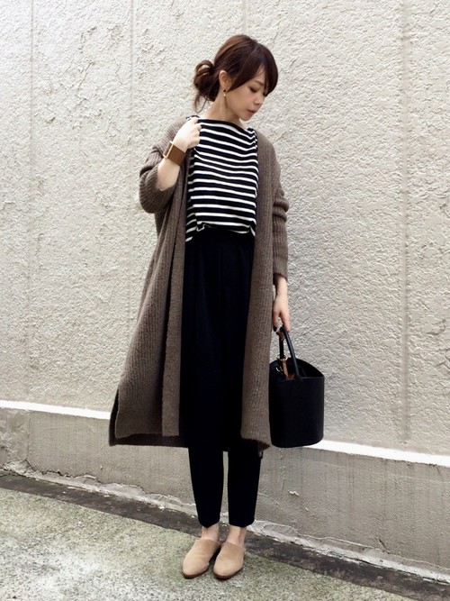 針織外套與條紋上衣簡約卻充滿大人感,如果把頭髮綁低馬尾或是盤成低髮髻,造型的完成度會更高喔!