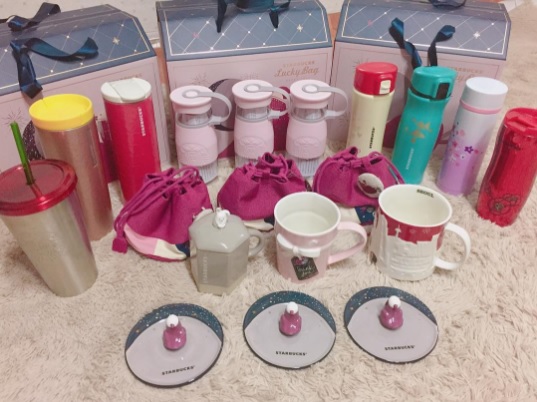 登登!以55000韓元的價格來說,這內容物也太豐盛了吧!一個福袋裡面有3種隨行杯、一個馬克杯、一個杯蓋、一個袋子,根本物超所值。