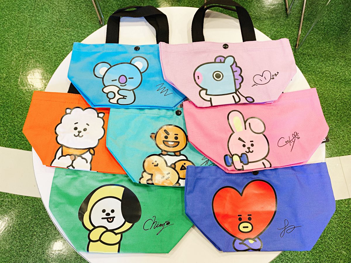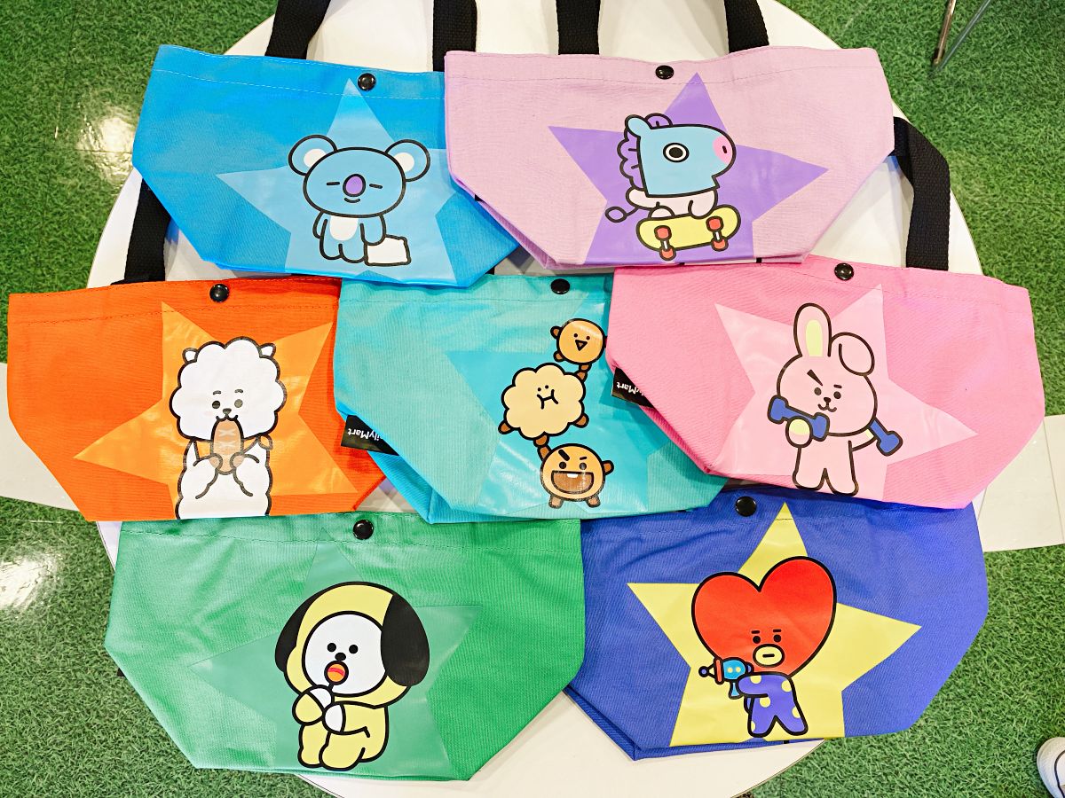 手提袋則推出了7位角色(沒有VAN),可用來裝便當盒或是隨身用品,設計相當繽紛可愛,正面印了宇宙明星的模樣&簽名,背面則以成員嗜好為圖案,像是RJ(羊駝)愛吃麵包、MANG(馬)喜歡溜滑板。