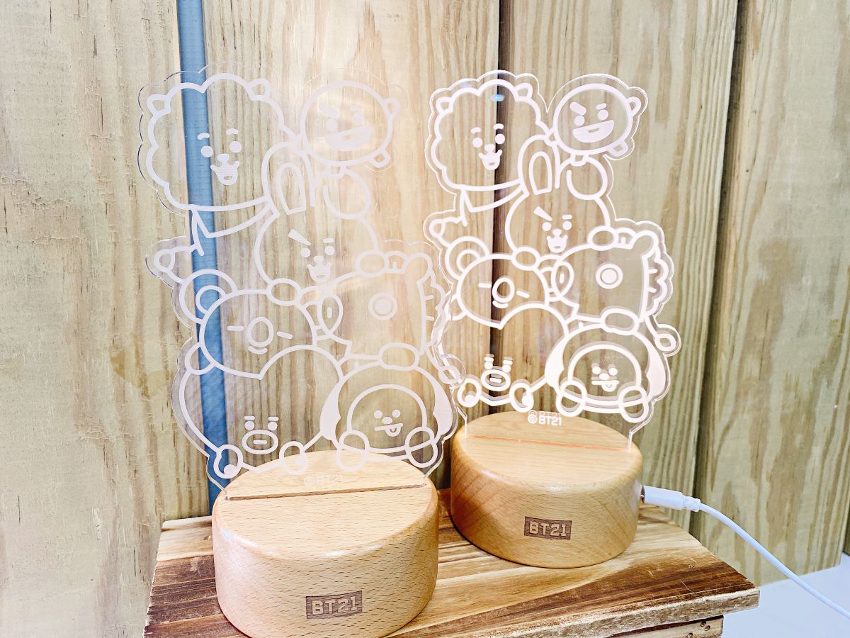 以後就讓宇宙明星點亮你的夜晚吧!這款夜燈以7位角色為圖案,木製底座印有BT21的經典LOGO,關燈時可作為一般擺飾使用,打開電源後則變成了療癒的夜燈。