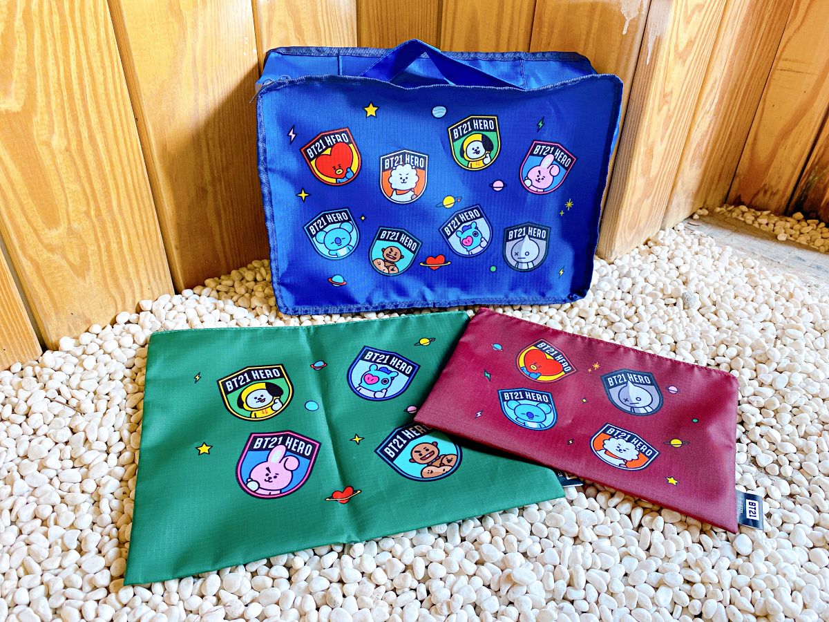收納三件組內含三種尺寸的收納袋,採防水設計,上面印有宇宙明星BT21的可愛模樣,日常使用或用來裝旅行用品都很合適;居家用品還有浴巾可收集,這款浴巾為台灣製造,採用提花設計,8位角色同台登場賣萌,讓粉絲看了就覺得很療癒!