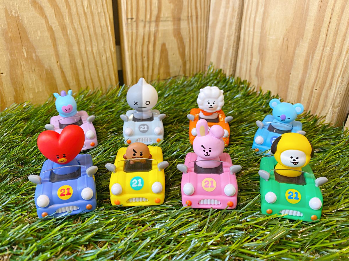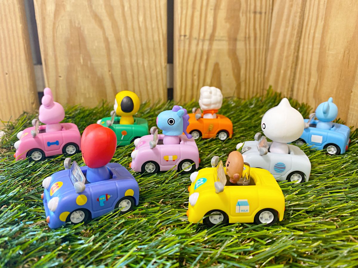 BT21宇宙明星超萌迴力車上路啦~(笑)TATA、CHIMMY、COOKY、KOYA、MANG、RJ、SHOOKY與Van等8位角色全員集合,迴力車顏色是成員的代表色,車身還印有成員的代表元素,像是TATA(紅色愛心頭)的車上印了雷射槍、COOKY(粉色兔子)有啞鈴,設計相當有巧思。