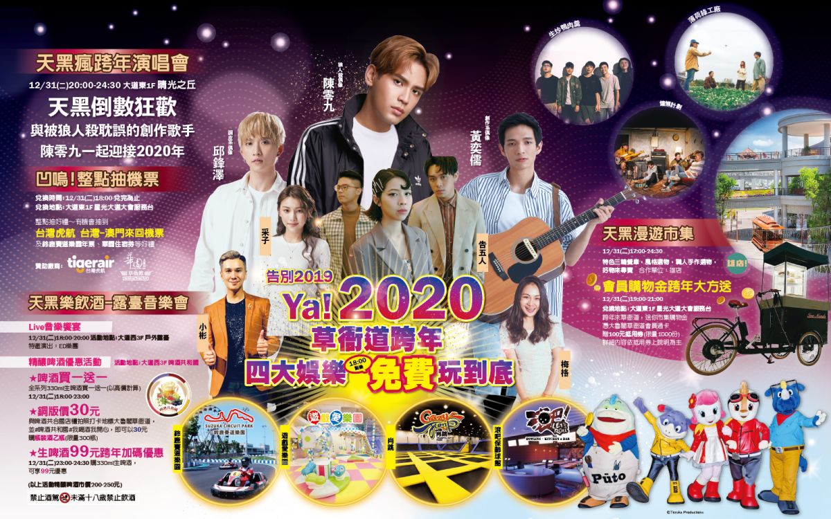 草衙道也有跨年晚會了!那天晚上園區裡的4大遊樂設施全部免費玩~邀請到的藝人除了歌曲超好聽的告五人以外,還有兩位「被狼人殺耽誤的歌手」──邱鋒澤以及陳零九,喜歡他們的妞妞就來到草衙道跨年吧!
