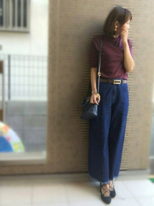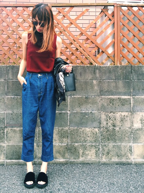 羅紋上衣與抽鬚牛仔寬褲雖然都給人比較休閒的感覺,但是紮入的穿法搭配上優雅的咖啡色方扣皮帶,大人感十足~
