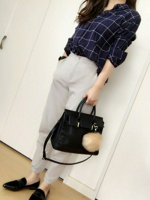 格紋襯衫果然是不敗單品啊!深藍色格紋襯衫不但可以將膚色襯得更顯白,也很適合辦公室的上班Look~