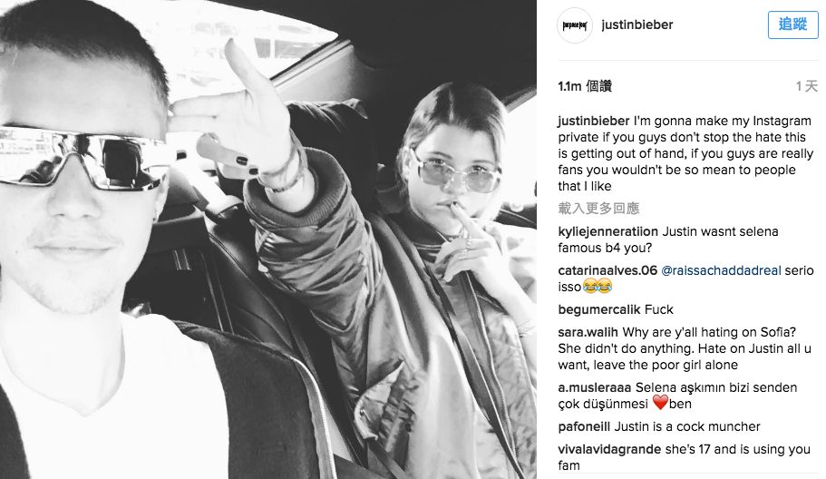 最近小賈跟新歡索菲亞李奇(Sofia Richie)的新戀情正打得火熱,不僅日本開唱帶著新女友同遊東京,還在IG上一連放上6張與女方的合照,如此高調曬愛的行為引起大批賈粉不滿,不斷湧入兩人的IG謾罵,甚至攻擊索菲亞,惹得小賈在最新PO出的合照中表示:「你們再鬧下去的話,我就要把我的IG設成私人帳號!如果你們真的是我的粉絲,就不該對我喜歡的人如此苛刻!」此番言論一出可以感覺到小賈的霸氣護愛,似乎有意跟粉絲宣戰!
