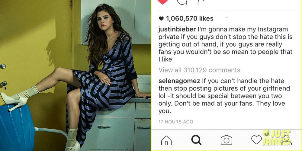 當然,粉絲們不會輕易對這樣的言論買帳,不過有趣的是,這則貼文竟意外釣出前女友賽琳娜(Selina Gomez)前來回覆!賽琳娜默默在下方留言:「如果你無法處理這些粉絲的憤怒,那就別再PO出你和女友的照片給大家看了!畢竟這是屬於你們倆的特別回憶,別因此而遷怒粉絲,他們是愛你的。」雖說賽琳娜回應的心態引人猜想,但不得不說,賽琳娜面對粉絲的EQ真的頗高啊!
