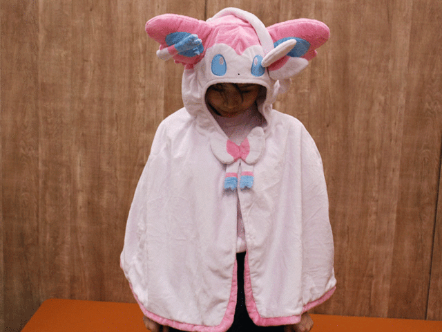 實際穿起來長這個樣子~伊布蓬蓬的尾巴真的超、級、可、愛!妞編輯好想要一件伊布披風,在辦公室一邊打稿的時候一邊披著抵擋冷氣的攻擊。(結果就被同事排擠惹)(小姐你穿這樣上班有事嗎?)