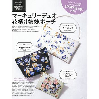 風格一向甜美優雅的steady ,這期的贈品是氣質滿點的花朵收納包三件組,附提帶的收納包很適合中午外出用餐時使用呢!深藍色收納包則可以當作化妝包,票卡與面紙就裝在小型的收納包裡,隨時隨地都要當個氣質美人!