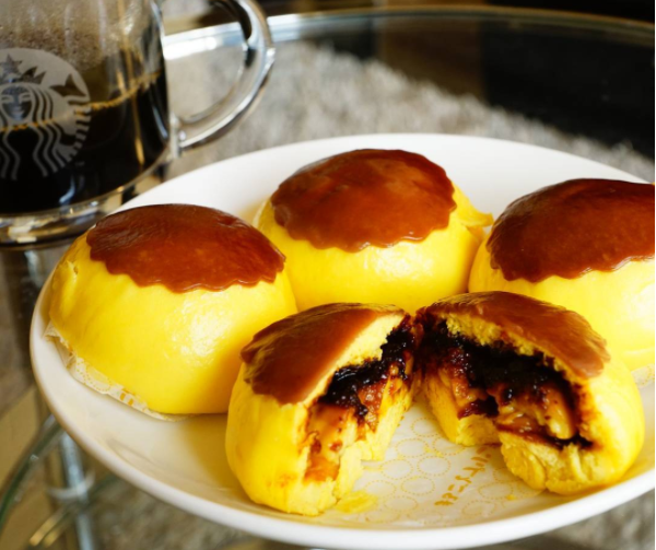 這款布丁包子毫不客氣地使用整、顆、布、丁把包子皮塞、好、塞、滿!!而且因為內餡的布丁很扎實的使用全蛋黃加上獨家配方製作,所以吃起來就是香氣特別濃郁跟香甜~包子皮上面咖啡色的部分是混合焦糖一起製作,整顆包子一口咬下去一定超無敵~~這絕對是布丁控們不可錯過的美食啊!