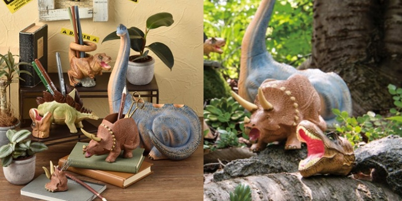 三角龍也被做成文具啦!溫馴的三角龍表情就沒有像暴龍先生那麼生氣了呢,不過VILLAGE VANGUARD也同樣將三角龍的輪廓都做得非常神似,運用了牠的頭盾讓大家可以把筆、剪刀等文具插在後面,使用起來也非常方便!