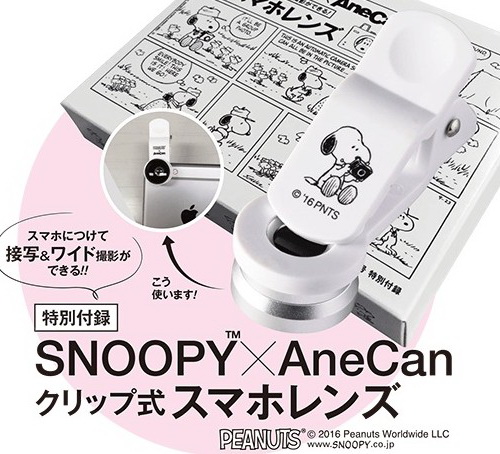 有姐姐版《CanCam》之稱的《AneCan》則帶來了相當有意思的贈品,那就是上頭有著可愛史奴比的特製手機用廣角鏡頭。相信拍照時看到拿著相機的史奴比一定會笑得更燦爛的!
