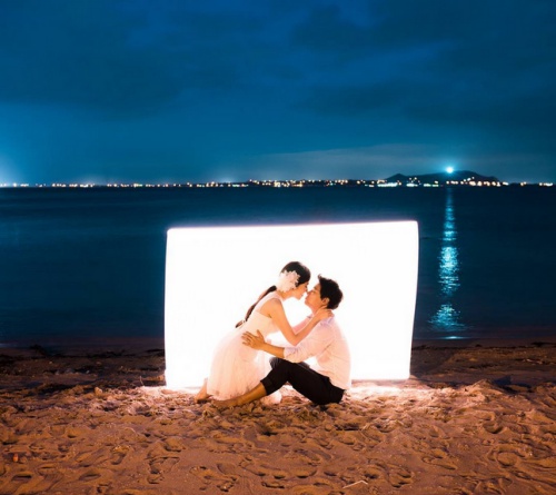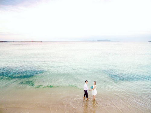 sonsungjoo拍攝婚紗照時,跟一般攝影師很不一樣的是,他很會利用「光影」來創造意象(摳揪哈基罵,完全不用擔心有背光的問題喔~)。天空還沒有被黑暗籠罩全的夜晚,大海和天空一樣的碧藍,穿著正式婚紗的兩個人,赤腳拍著他們愛情裡的純粹與單純(磨鼻子太害羞了)