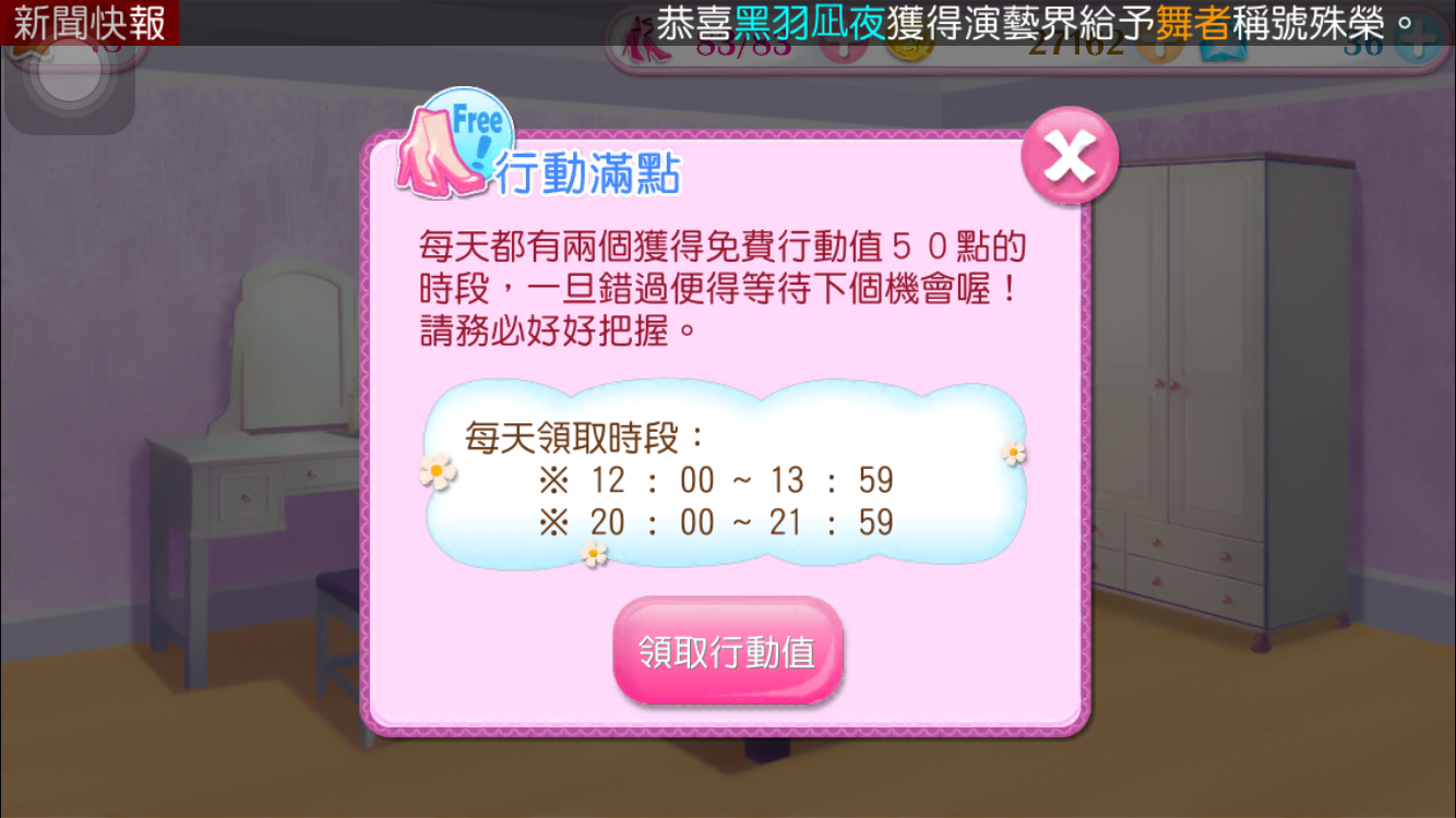 通告、培訓、探索都超花行動力,看到它歸零的瞬間,心情也down到最谷底(整個就是玩到著魔的境界啊〜)而每次都要等、等、等,等好久才恢復,(手機小姐在等待過程都超煎熬,都會忍不住 怒喊:給我行動力啊〜)後來發現其實有小撇步啦,除了每5分鐘會回復1點行動點外,每天有兩個時段可以免費獲得行動點,另外如果跟手機小姐一樣沒耐心的妞妞們,可以在商城購買行動點道具使用,可以節省不少等待的時間。