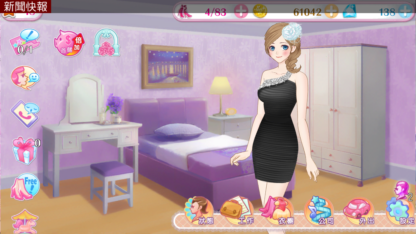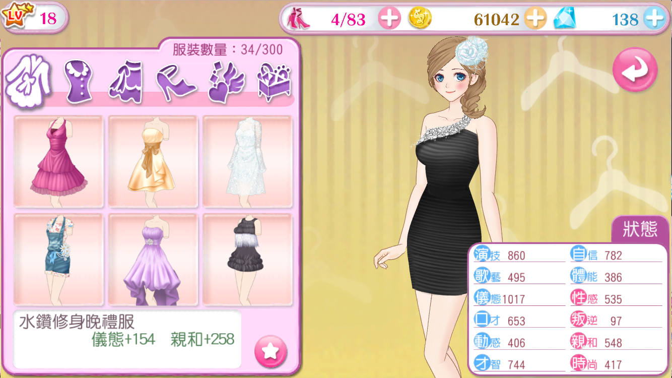 不同於過去制式化的人物造型,此款遊戲可以讓玩家打造出屬於自己的獨特明星模樣。還有多款服裝與配件可以搭配更換,透過換上不同造型,可以增加主角的各項能力數值(如果主角的屬性數值不夠,不能接通告,就用這方式來提升能力吧!)