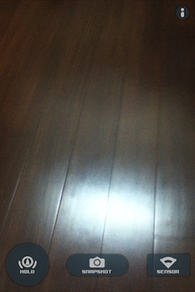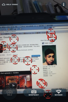 點開遊戲的圖示後就可以發現AR Missile身為超級舒壓APP的無庸置疑的潛力,諾貝爾第一次點開就為它的簡單到爆開的界面所驚嘆,操作不需要花額外的頭腦。畫面除了同步顯示鏡頭拍到的畫面之外,就只有簡單的三個按鍵,分別是hold,snapshot,以及sensor。