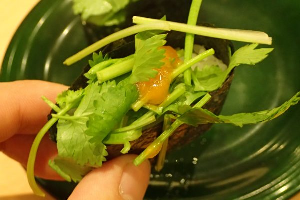 不過這股香菜熱潮可不只在超市裡發生,以關東地區為主要據點的連鎖迴轉壽司店「がってん寿司」,三月時居然推出了新口味的「香菜軍艦壽司」。店內使用的是日本國產香菜,香菜味不會太重,味道清新容易入口。根據日本網路媒體的評價,這款香菜壽司醋飯的酸味與蘿蔔醬汁的甜味,能夠將香菜的特殊氣味蓋過,即使是討厭香菜的人也可以成功完食。