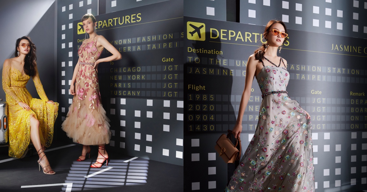 芝加哥頂級訂製品牌JASMINE GALLERIA於2018年底舉辦『Bon Voyage奢華旅人』時尚秀驚動台灣時尚圈,2019年高級訂製PRIVÉ系列婚紗創造出極簡時尚婚紗風潮,2020年適逢疫情來臨,不畏艱難的設計團隊在後疫情的今天,以「Fashion Check In」開啟了人們侷限已久的度假心意,運用跨國界時尚結合了高級面料絲綢、精緻工藝、頂級刺繡與台灣藝術家的創意圖樣數位印刷,眾所期待下輕裝革命設計以「Resort度假」為核心概念,邀約大家共同領略全新國際時尚與超狂度假風格服飾,擺脫沈悶與無聊,飛向自由浪漫的想像國度。活動現場選在超六星級的台北文華東方酒店大宴會廳全開舉辦,巨型的航空時刻看板立即點出本次時尚大秀的主題,壯觀吸睛,貴賓採用登機證入場以及提供護照設計的時尚手冊,一步一眼所及所見,都是滿滿的機場情境,啟動所有人時尚出航的慾望,讓人更加激動期待這場浩蕩出遊的度假大秀。邁入JASMINE GALLERIA大氣滂薄的時尚大門,引人進入彷彿海外奢度假飯店的情境,特邀實力派歌手倪安東以充滿感性靈魂的聲線展開序曲,丰姿旖怩穿梭全場的模特兒們以繽紛的色彩、充滿藝術氣息的設計,超越時空與國度,挑動追尋自由的靈魂。