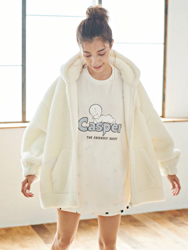 可愛又善良的卡士柏出現在服飾單品上,搭配清爽、舒適的白色、藍色配色,可居家、可外出穿的聯名T恤以及洋裝一推出就被嗆到缺貨!整件用羊咩咩絨毛打造的「鬼馬小精靈毛絨絨連帽外套」也超犯規,純白色系讓你一穿就像置身於雲朵,心情跟著飛揚~
