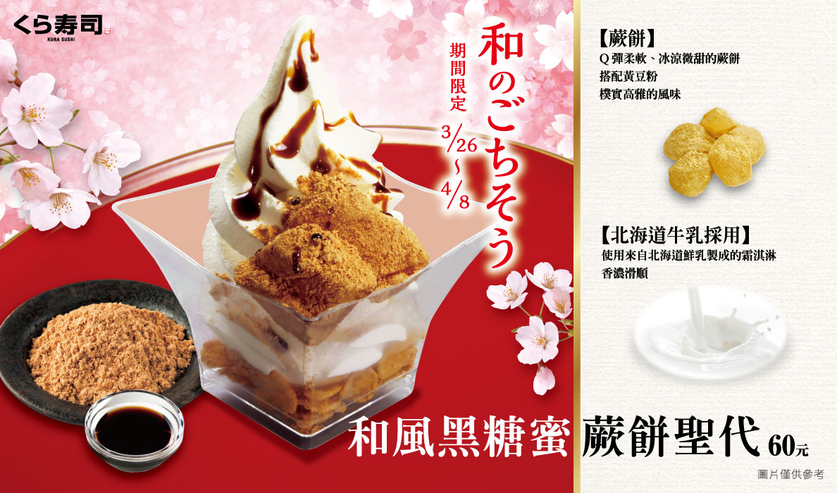 除了療癒的新扭蛋即將登場,限時的新品握壽司和甜點也是不能錯過!藏壽司在3月19日推出了三款超犯規握壽司:炙烤起司長鰭鮪魚、特製胡麻醬鮮蝦、特製七味醬豬。甜品部份則是將在3月26日上市結合傳統日式甜品與霜淇淋的和風黑糖蜜蕨餅聖代~滑順口感的霜淇淋,再加上Q彈柔軟的蕨餅,冰涼微甜的口感於嘴中淡淡化開,絕對是飯後必點♡
