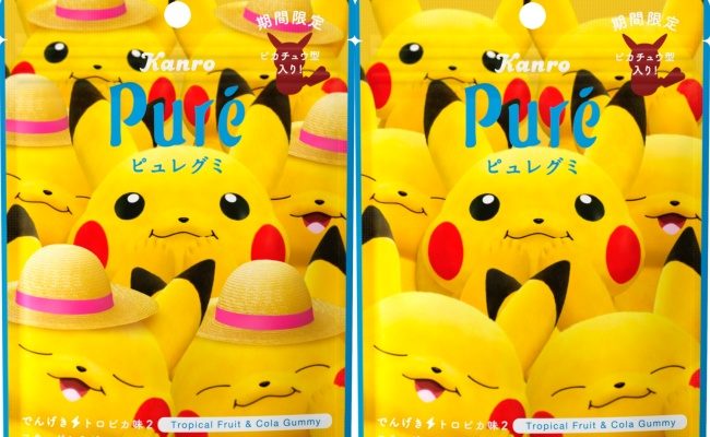 「Pure」是日本零食大廠Kanro旗下熱賣商品之一,這次不僅推出限定版「皮卡丘包裝」,口味上更是讓人躍躍欲試,其主打夏季代表性水果鳳梨、芒果及香蕉口味(ピュレグミ でんげきトロピカ味),芒果香蕉的濃郁香氣佐以鳳梨的酸甜開胃,光想像就已經忍不住想嚐一口啦!不僅口味讓人感受滿滿的夏季風情,軟糖造型也能看見皮卡丘的身影,用發出電擊模樣表達酸溜溜的感覺,簡直軟萌人心。