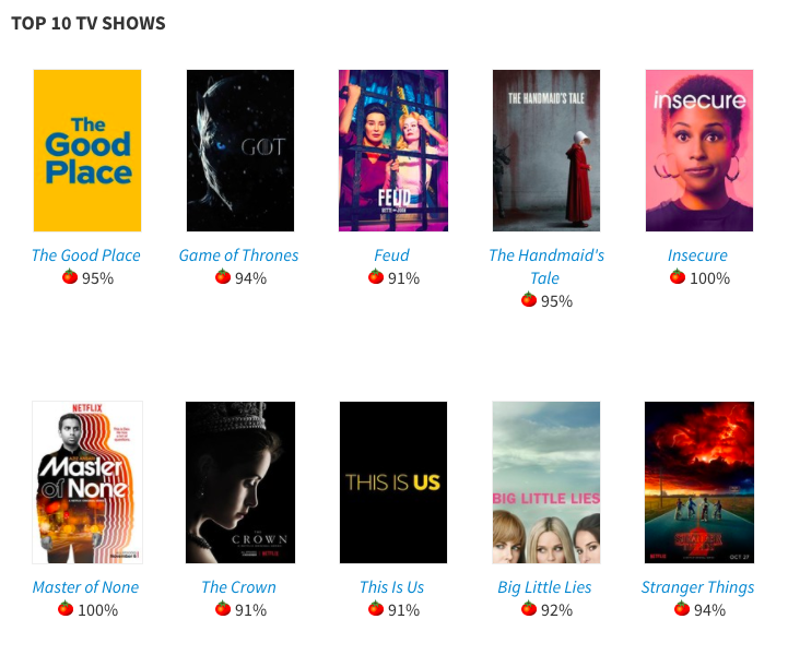 而討論度極高的《使女的故事》(The Handmaid’s Tale)、由大咖影后們共同演出的《美麗心計》(Big Little Lies)還有讓人哭到不行的《這就是我們》(This Is Us)也通通在Top 10名單當中,完全實至名歸啊!