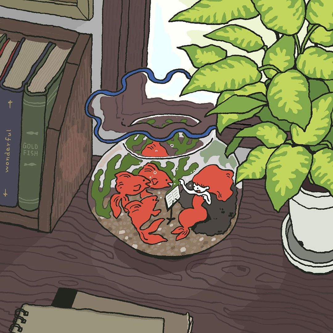 第一件要推薦的作品是金魚缸裡藏嬌美人魚,這也是讓妞編輯一眼就愛上IRAKAADUKO畫風的入坑洞。相信每位女孩都曾幻想自己可以是一條快樂的美人魚,自由自在地徜徉海中,而IRAKAADUKO便將這夢幻人魚結合日常家中的金魚缸,美人魚悠揚地哼著歌,像是音樂教室般連整幅插畫都動感了起來!