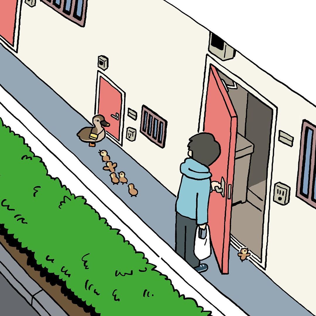 當你回到家正要入家門時,發現小鴨媽媽眼巴巴地直盯著你,原來是它發現了小鴨孩子們少了一隻,而那一隻脫隊的呆萌鴨還正要走入你家門。(是不是也覺得有夠可愛)