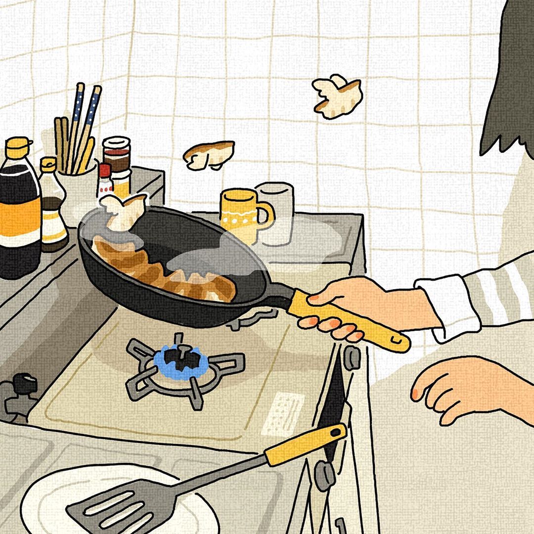 想像當你正在煎著香噴噴的鍋貼時,鍋貼居然變成鳥兒飛了起來,不管是帶著香氣陣陣撲鼻,還是因為鍋底太燙想飛逃出鍋(?),看到這幅畫的人相信一定都會跟妞編輯一樣忍不住笑了起來。(看來作者的靈感來源應該就是在煎鍋貼時了吧!)