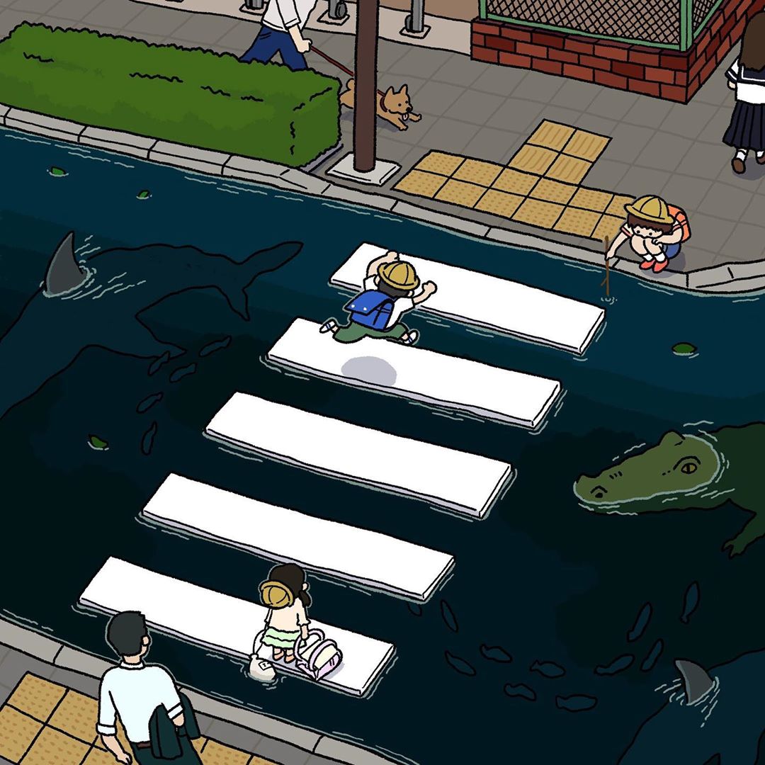 如果有一天斑馬線底下變成了海洋隧道,應該會很夢幻吧!但IRAKAADUKO才不會一味地迎合妞妞們的(白日)夢,海底隧道中沒有金魚、海豚、珊瑚等夢幻的景象,而是令人聞之色變的鯊魚和鱷魚,若是不好好走在斑馬線上可是會被吃!掉!(好像有點適合當交通宣導圖耶xd)