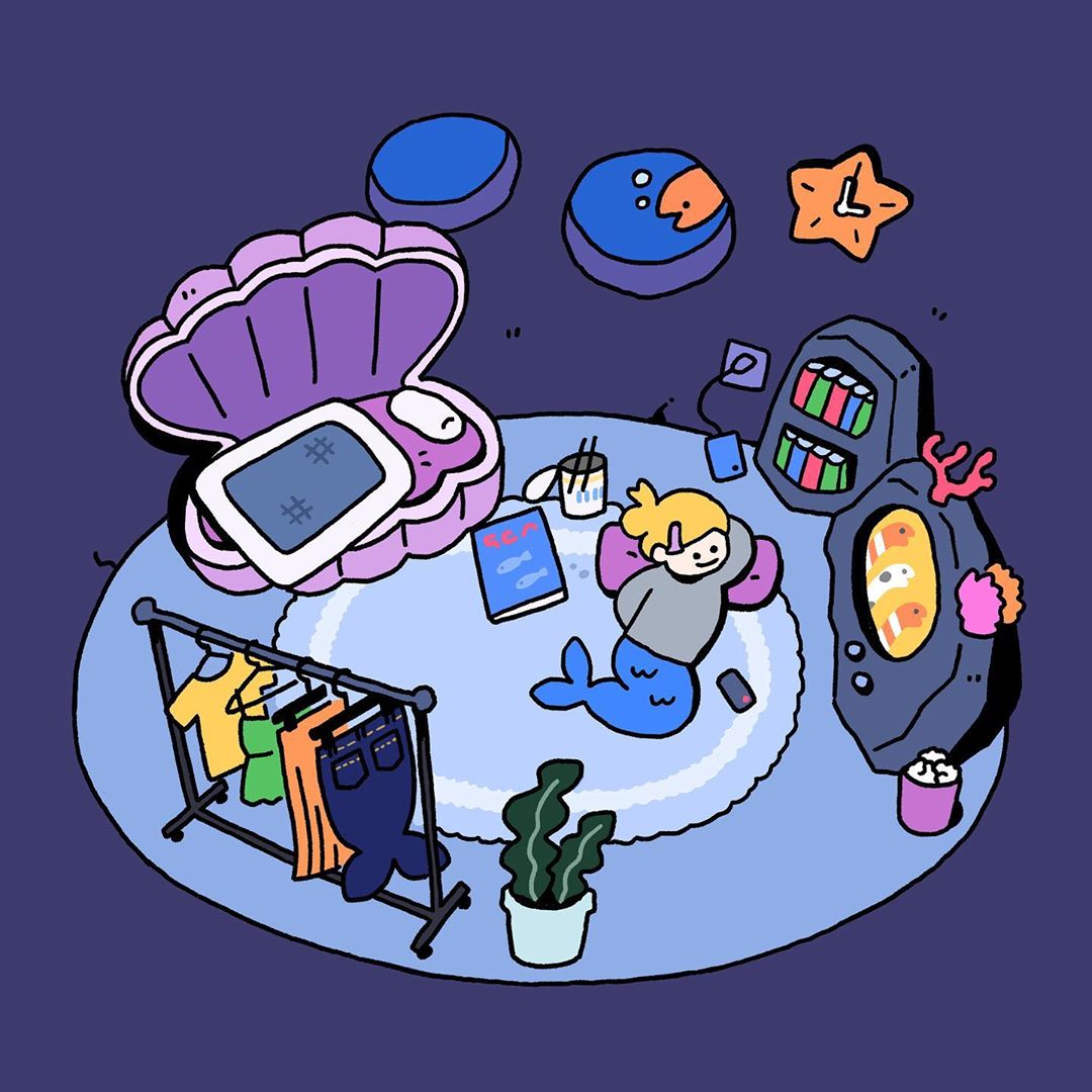 除了美人魚躲到金魚缸裡之外,IRAKAADUKO也畫出美人魚的日常生活,其實她和普通人沒兩樣,假日在家也是吃完杯麵再慵懶地臥躺追劇,妞妞們是否也覺得自己就像條美人魚呢?圖中還可以發現美人魚的衣服品味也是很不錯呢!(笑)