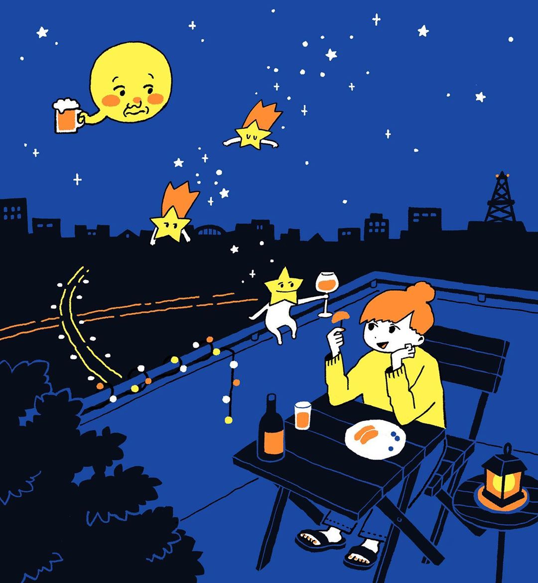而這幅作品也讓人感到相當暖心,尤其是離鄉求學、就職或是自己一人獨住外面,每到夜深人靜時難免會覺得有點寂寞、想家,但一看到這件作品就覺得不孤單了!不光有星星、月亮陪著你,還有IRAKAADUKO的插畫伴隨你左右。