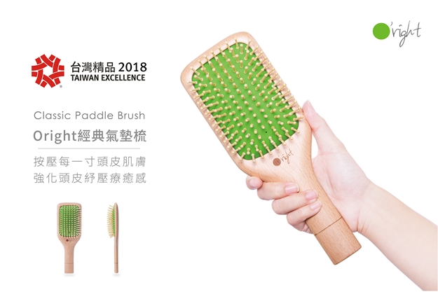O’right歐萊德繼2017榮獲台灣精品獎三大獎項後,再次參與由經濟部國貿局主辦、外貿協會執行的「2018台灣精品獎」選拔,在全台報名的578家廠商、1209件商品中脫穎而出,獲得台灣精品獎殊榮。這也是歐萊德從2014年首度獲得精品獎後,第四度參與精品獎角逐及獲獎,本次並以兩項產品同獲大獎肯定。「O’right經典氣墊梳」採用天然櫸木為本體材質,以傳統工法手工磨製,成功將手作工藝與綠色時尚完美結合。梳背加大立體氣墊空間,形成充滿包覆感的立體氣墊,梳理頭髮的同時能達到氣壓按摩的效果。