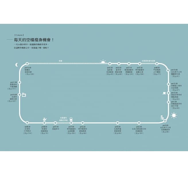 那到底黃金空擋抓住了!要搭配什麼運動才能精準甩掉贅肉?這本幫你規劃每天日程的時間、地點最適合的瘦身運動,加上健身大師親自示範的動作圖解,等捷運時偷偷踮腳上提、跟同事聊天時單腳後抬、刷牙時一邊深蹲、看電視一邊踩腳踏車、甚至連在約會時都有機會可以偷減肥(笑),不方便掏出書也有解,隋書附上的QR Code,手機一搜就能無阻開練,養成24小時自動燃脂的易瘦體質,(飲食攻略&週末加強&急救塑身法也收錄)
