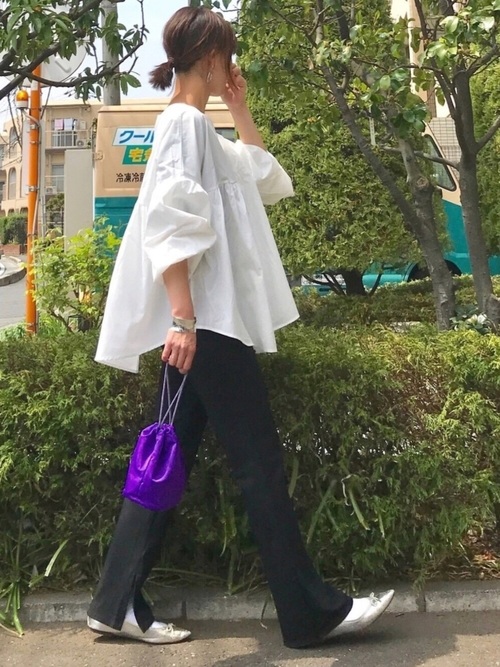 黑白色系的穿搭只要手上拿一個亮色系包包整個人瞬間變得很亮眼!束口包是今年日本妞妞的超夯單品,絕對要購入一個!