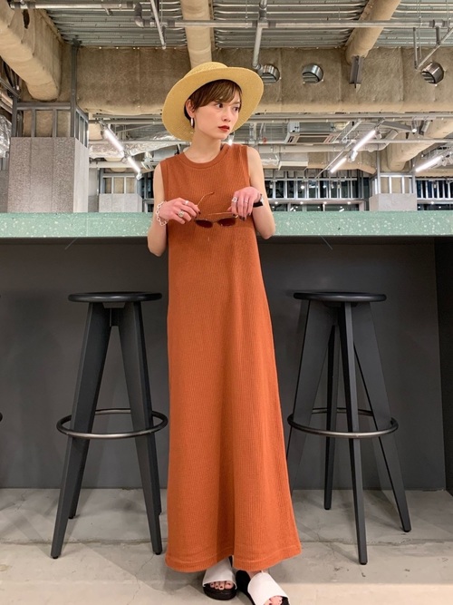 夏天如果去海邊度假或是去熱帶國家玩,可以穿這樣!草帽配上長版背心裙、墨鏡、白色拖鞋,看起來超有海島風,橘色的色系也很符合夏天~