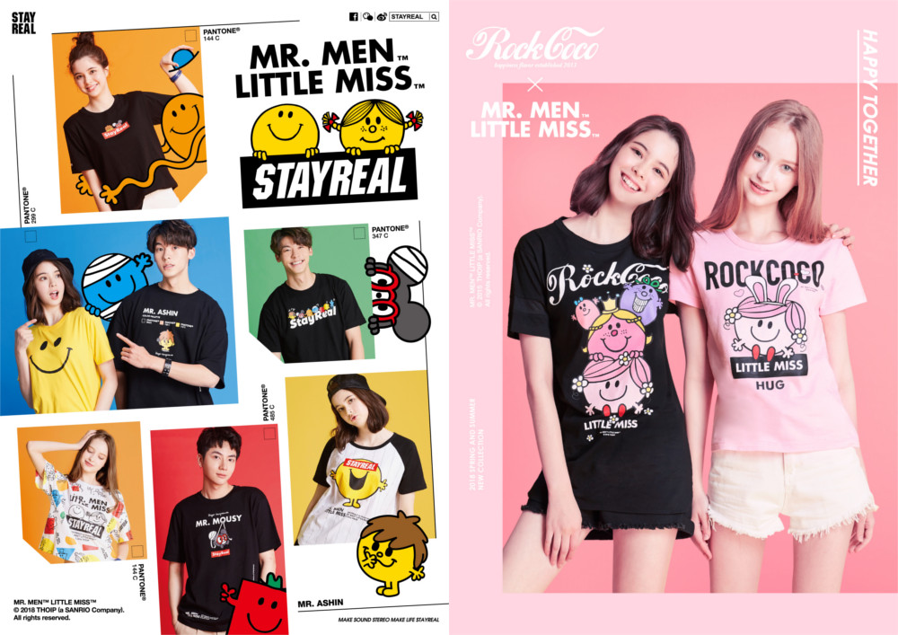 奇先生妙小姐(Mr. Men Little Miss)誕生於1971年,由來自英國知名的插畫家Roger Hargreaves所創作的繪本,以生動、趣味且具有啟發性的特色深受大人與小孩喜愛,在全世界廣受歡迎,至今已成為全球經典的文學繪本之一。這次在雙方共同創造繪製下,將阿信與小鼠變成繪本中的角色人物,化身MR. ASHIN與MR. MOUSY闖入奇妙家族,以簡單的線條勾勒加上生動的自然神情,與奇先生妙小姐(Mr. Men Little Miss)中的經典人物齊聚一堂。另外,STAYREAL旗下女裝品牌ROCKCOCO則是精選Little Miss四款人氣角色,包括擁抱小姐、公主小姐、玲瓏小姐以及淘氣小姐,以純真歡樂的氛圍結合熱燒的流行色系「乾燥玫瑰粉」與「Ultra Violet 紫外光」,讓女性服飾也能輕鬆跟上時尚潮流!這次奇先生妙小姐(Mr. Men Little Miss)聯名系列也提供更加多元的服飾版型,包括休閒風格的T-shirt、流行剪裁的Oversize寬版T、另外還有STAYREAL擅長的創意變身設計以及ROCKCOCO特殊的修身顯瘦剪裁,款款都是繽紛亮眼的百搭選擇!