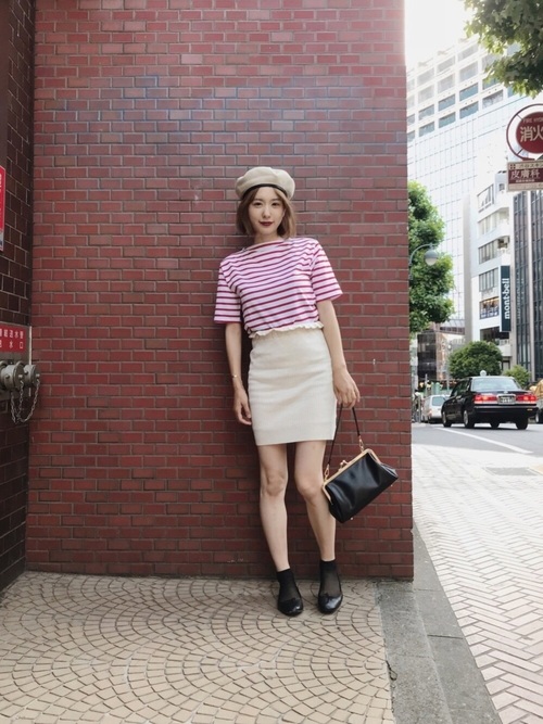 粉色條紋短版上衣搭配駝色窄裙,將休閒混搭微性感風格,巧妙地用駝色貝蕾帽和黑色單品做重點裝飾,營造出甜美又好親近的人氣造型。