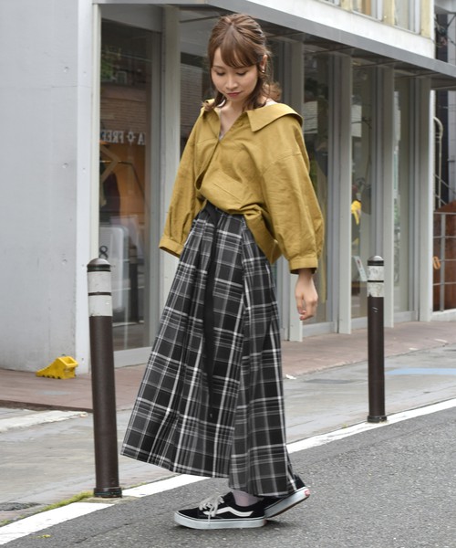 格紋元素是衣櫥裡不可或缺的必備單品,黑色格紋長裙搭配黃色蓬袖襯衫,腳踩基本款球鞋,打造出甜美中又帶點潮味的風格穿搭。