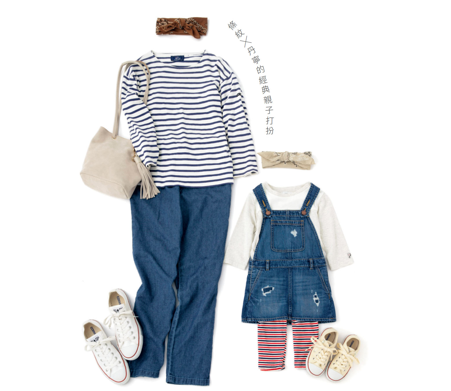 這裡介紹的是小女孩與媽媽的親子穿搭。條紋的粗細與丹寧的刷色程度就算不一樣也無妨,是一種簡單基本的搭配。