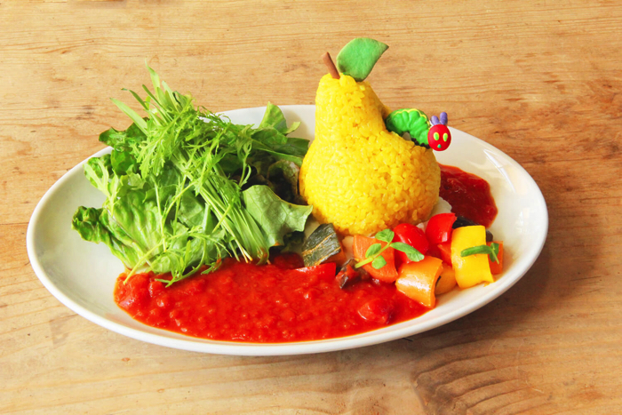 咖啡廳菜單以“吃東西的樂趣”為主題,用大家最喜歡的法式吐司、蛋包飯、漢堡肉,及義大利麵等料理來呈現出「好餓的毛毛蟲」世界。