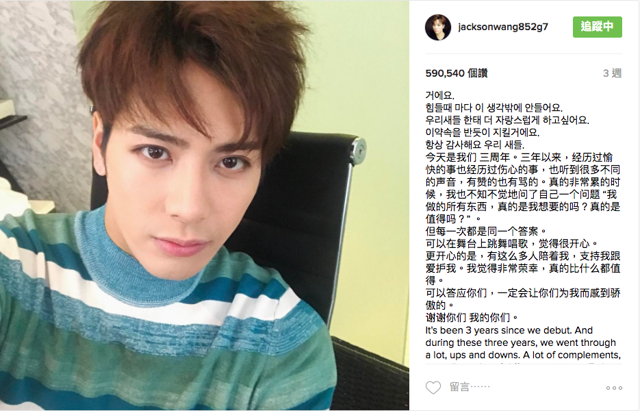 GOT7可以說是「暖男團」,團員各自都很喜歡在社群上和鳥寶寶們「公開放閃」,如果要說其中最閃的,絕對是團員王嘉爾Jackson啦!王嘉爾是香港人,每次都把自己當作翻譯機,PO文附註韓文中文英文3種語言,不愧對全球最受歡迎的稱號,各國紛絲都照顧到了!