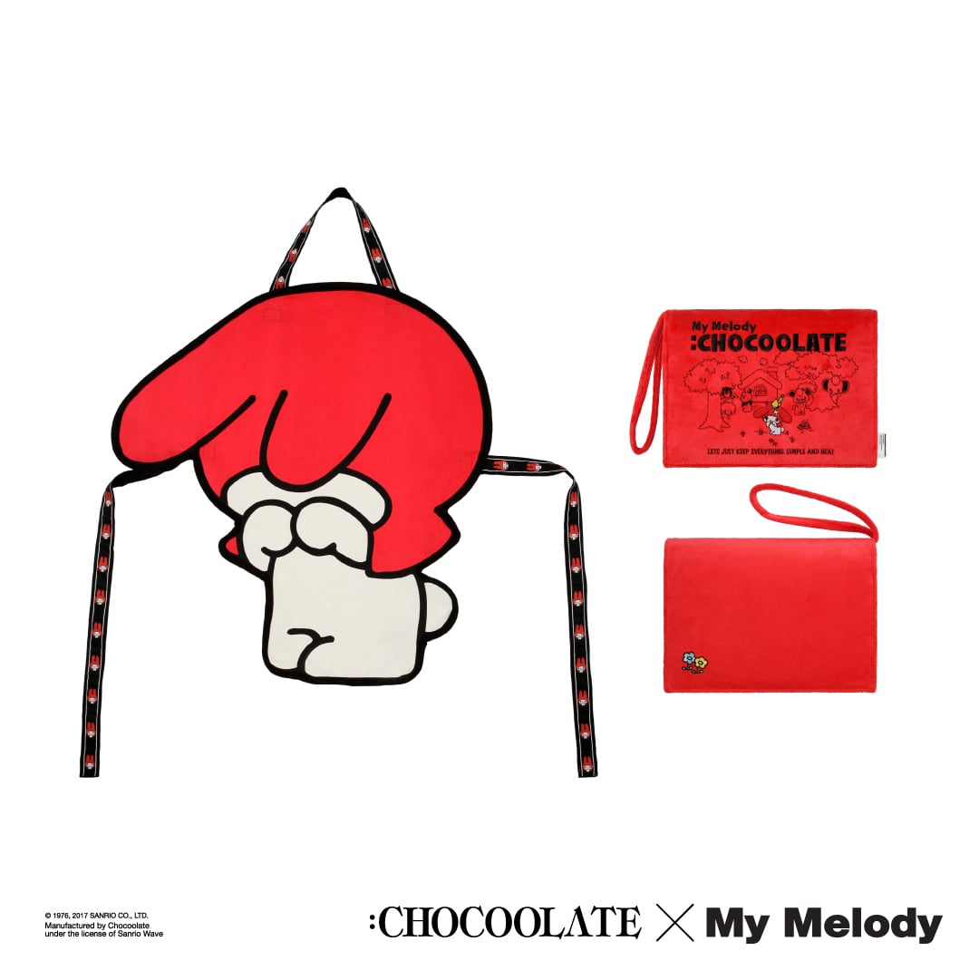 :CHOCOOLATE於這個冬季首度帶來深受女孩子歡迎的My Melody聯乘系列。這次聯乘以My Melody經典小紅帽造型、「小老鼠Flat」及「小綿羊Piano」圖案印花為主軸,部份單品更以My Melody ALL- OVER PRINT織帶作點綴。