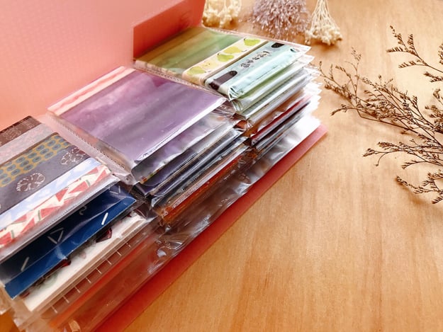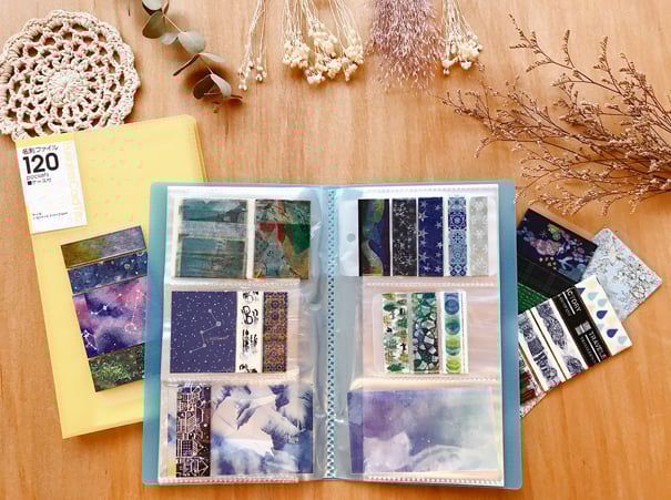 原本為了整理名片買了收納本,意外發現紙膠帶分裝片放進去剛剛好!不過大概裝三分之一就很厚了,裝到三分之二是極限,肥肥的需要橡皮筋綁住哦。