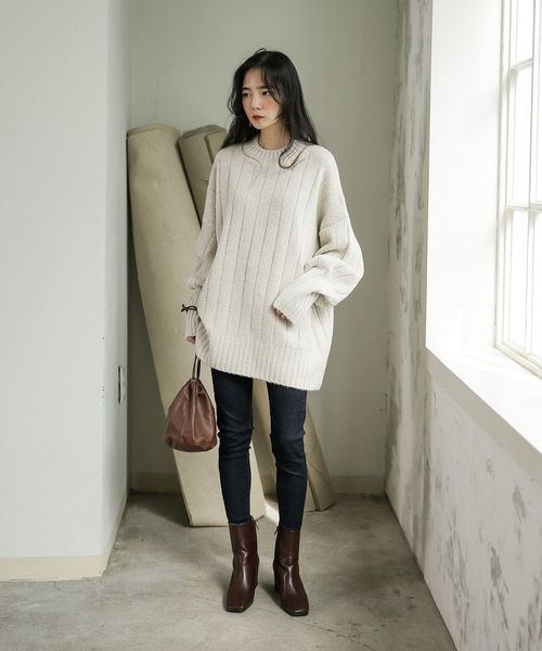 一件寬鬆的毛衣最能塑造慵懶的氣質了~想要顯瘦就一定要穿緊身褲或窄裙,今年流行的咖啡色束口包和咖啡色靴子顏色互相呼應,整體看起來很和諧~