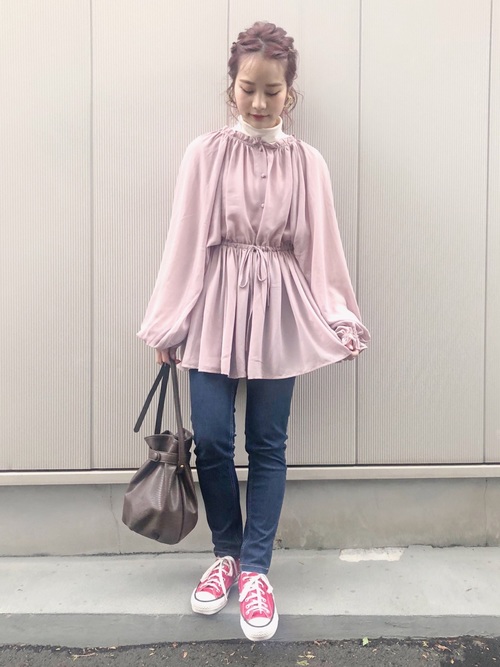 縮口的雪紡上衣看起來很仙,但是配上牛仔褲又是另一種風格~妞妞手上的那款束口包好可愛!