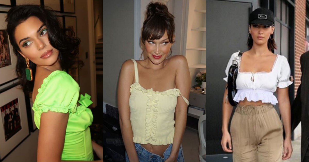 一穿上就可愛極了的小荷葉邊上衣在今年春夏以短版設計為主,尤其是kendall穿的這種螢光綠色上衣,這個色系在今年春夏也會是值得關注的顏色,這種大面積露出胸口肌膚的設計其實非常顯瘦,也能拉長臉型喔